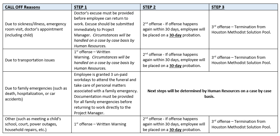 IMPORTANT: Please remember your assignment is considered a “working interview” and you are representing Dean’s Professional Services. Your attendance, professionalism, and work performance are extremely critical to your tenure as an employee in the solution pool and also the opportunity to convert to a regular full-time employee with Houston Methodist. Failure to adhere to the policies and procedures set will result in disciplinary action, up to and including termination.